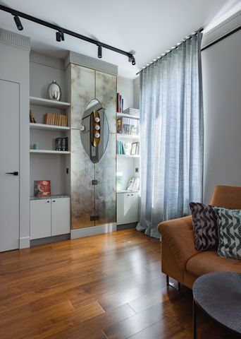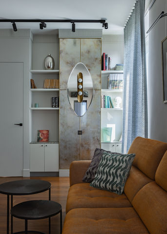 The three interior doors adjacent to each other, devoid of moldings and painted to match the wall color, along with the modular dimensions of all niches and partitions, ensure that this part of the living room does not feel visually cluttered. A decorative mirror with an aged Venetian glass effect is positioned between two niches, complemented by a vintage light fixture in the center.