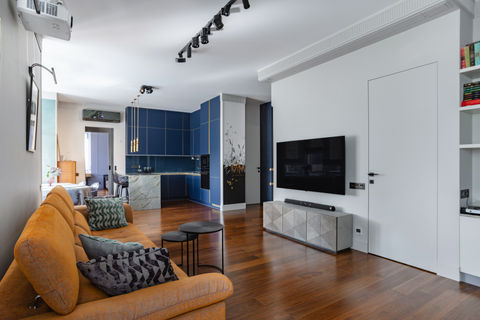 The living room is equipped with a home theater system featuring a ceiling-mounted screen that descends via an electric drive. Additionally, ceiling-mounted tracks with technical lighting allow for customizable lighting scenarios throughout the day.