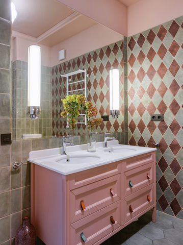 The interplay between the bathroom and the bedroom is a central theme in the decor. The shared wall is adorned with green marble, and the headboard of the bed extends into the bathroom, visually unifying the two spaces. The bathroom mirror reflects the marble into infinity and captures daylight, filling the space with natural light. The bed area is highlighted by a soft, fabric headboard designed according to our sketch. The geometric, slightly Eastern pattern of thin plaster moldings on the ceiling and the minimalist plaster frieze on the wall organize and center the chandelier placement above the bed. This design also enables hidden ceiling lighting and concealed textile mounting on both sides of the bed, adding a touch of theatricality to the interior.